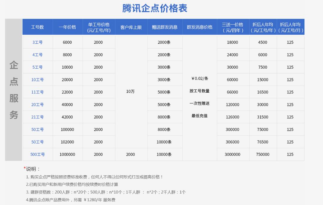 腾讯企点3个号数一年的价格大概是六千块,也就是说一个工号就要两千块,客户库存量达到十万人,可以群发两千条的消息,群发一条信息要0.02元。以此类推,5个工号价格大概是一万元;10个工号需要支付两万元;50个工号那么就需要话费十万元。